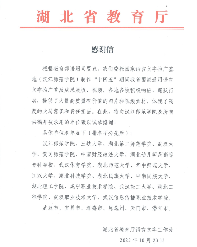 近日,湖北省教育厅语言文字工作处向我校发来感谢信,对我校在“十四五”全省语言文字推广普及成果展示中提供大量高质量有价值的图片和视频素材表示感谢,对学校的语言文字工作给予高度肯定。